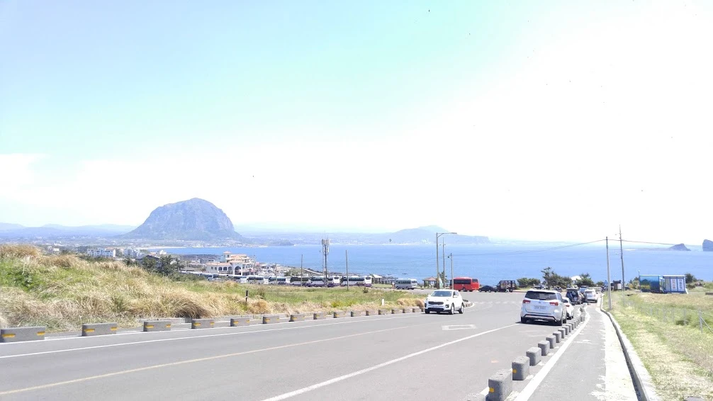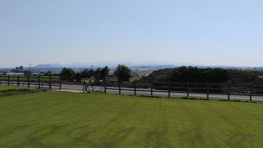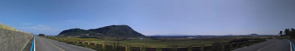 지난 밤 같이 묵었던 게스트하우스 사람들 중 자전거 여행을 하시는 분을 두 분이나 마주쳤다. 그 중 한 여자분과는 밭과 들판을 양쪽에 둔 길고 완만한 경사길에서 여러번 앞질렀다 뒤처지기를 반복했다. 전기자전거를 끌고 가는 나는 나대로 길이 아까워 웬만하면 모터를 끄고 다녔고, 뭔가 허술해보이는 예쁜 자전거를 탄 그녀는 언덕길에 힘겨워했다. 막판에 급해지는 경사길은 거의 지구력테스트였지만 여기는 넘어갈만한 가치가 있는 곳이었다. 언덕을 돌아내려오자마자 시원스레 펼쳐지는 경사길과 그 아래 바다, 그 건너 밥공기같은 송악산을 보면 "브레이크 없이 가자"는 생각부터 든다.