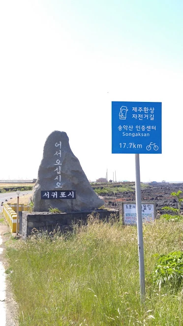 제주시에서 서귀포시로 넘어간다는 시 경계석. 드디어 남쪽 나라 중에서도 남쪽 나라로 간다는 기분에 약간 들떴던 기억이 난다. 오른편에 계속 파란 바다가 펼쳐지는 길이었다. 쉴 새 없이 눈을 바다에 붙이고 갔다. 사진이 담지 못하는 색깔에 기분이 아쉬워서 눈에 걸쳐놨던 썬글라스를 카메라 렌즈에 겹치고도 여러번 찍어봤지만, 그 빛이 반사된 새파란 색이 나오기는 어려웠다.