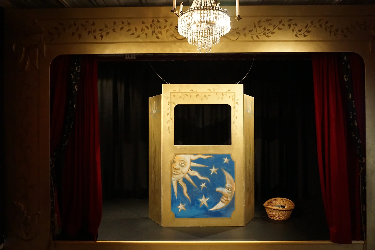다시 옆 방으로 가면 이번에는 그럴듯한 무대가 있다. 무대에 핀 조명이 꽂히는 가운데, 꽤나 정교하게 생긴 샹들리에와 커튼까지 있다. 바구니엔 무대용 의상(?)과 손에 끼우는 인형들, 역할카드가 있다. 벽면에는 작은 설명이 있다.