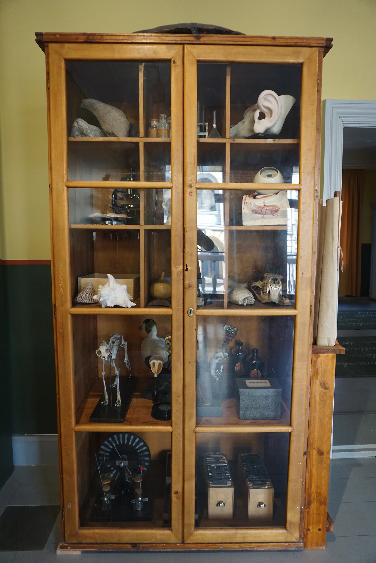 마냥 옛날 직업 체험의 장소이기만 한 건 아니다. 수납장 안에는 정말 제대로 만들어진 인체 부분의 모형과 동물 뼈 모형이 가득 들어있다. 물론 열어서 꺼내서 활용하라고 넣어놓은 것 들이다. 현미경과 암석 표본, 옛날 스타일의 플라스크 등 생물뿐 아니라 물리 화학 지구과학 선생님 놀이를 전부 다 할 수 있다. '선생님 놀이'라고 말하는 것은, 이 수납장 바로 옆에는 '교실'이 있기 때문이다!