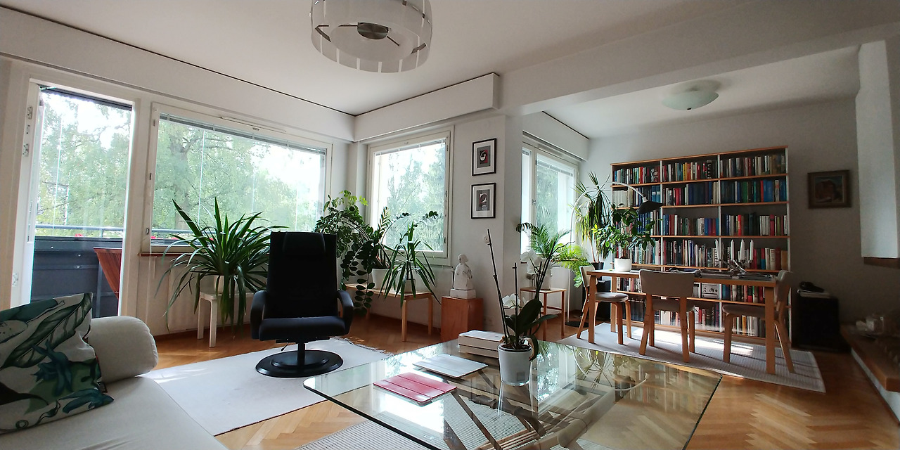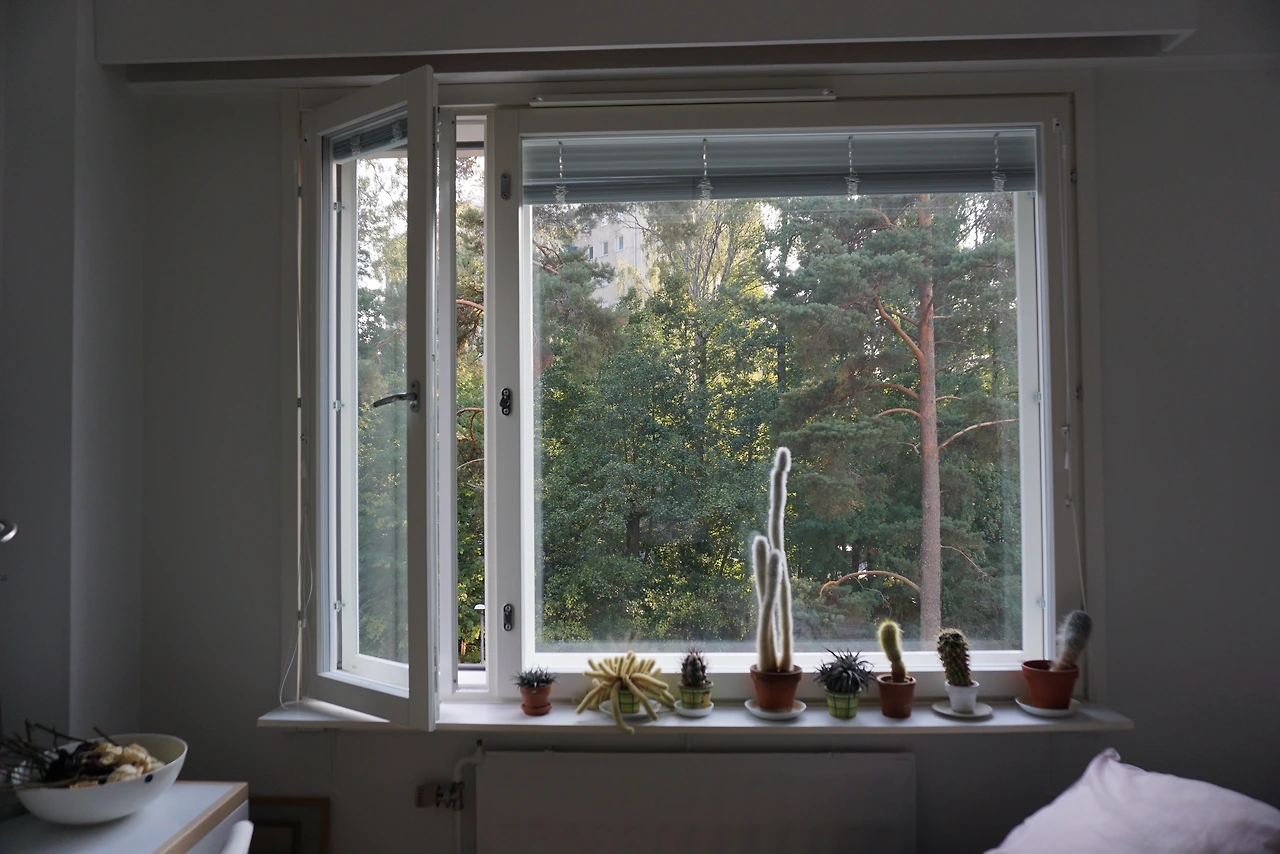 부모님(한나마이야 씨와 미코 씨 부부)과 두 대학생 자녀로 이뤄진 가족이 사는 집은 헬싱키 중심에서 버스로 20~30분 정도 떨어진 거리에 있었다. 자전거로 불과 10분 거리에 아름다운 해안이 있는 곳. 모든 벽에 그림이 걸려있고, 모든 창가에 식물이 자라고, 모든 공용공간에 빼곡한 책장이 있는, 믿을 수 없을 만큼 아름다운 집이었다. 흰색 벽과 절제된 가구 색상, 푸른 화초, 마리메코 이불과 수건 등 우리가 생각하는 전형적인 '북유럽 인테리어'라는 것이 오히려 더욱 신기했다.