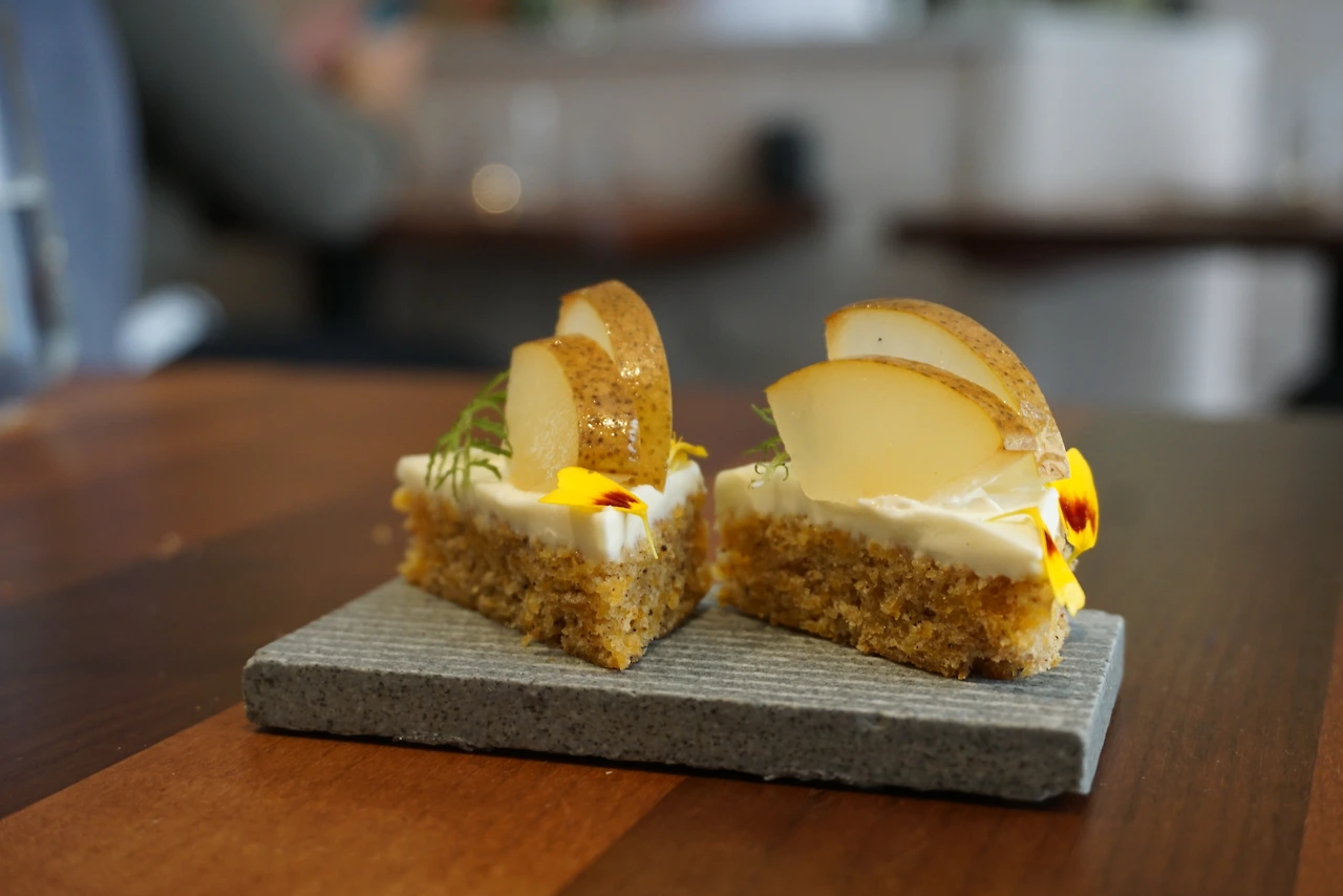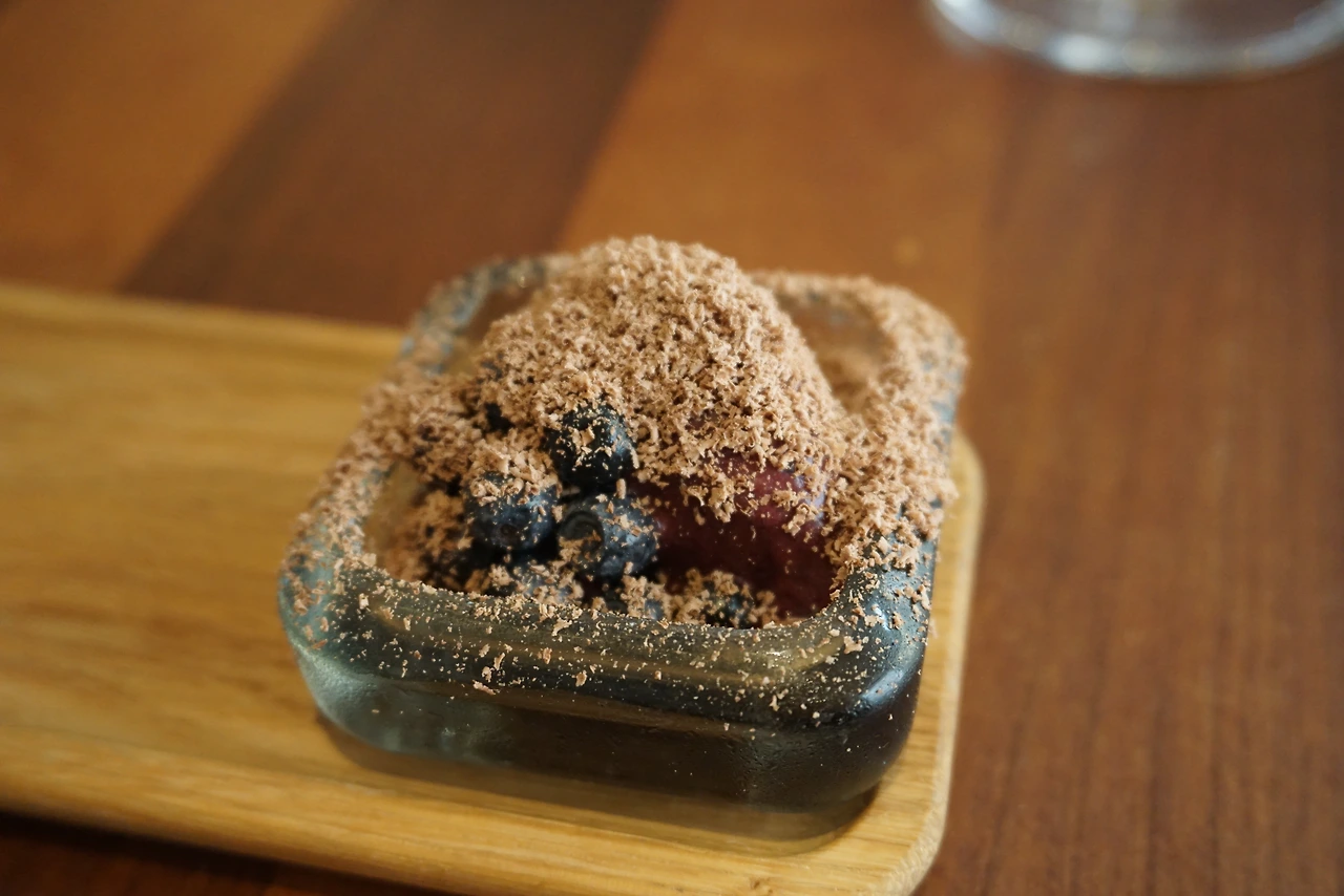 코스 음식에서 메인을 먹기 전 입맛을 돋워주는 애피타이저가 있는 것처럼, 메인 디저트(??)를 먹기 전에 준비성으로 주는 프리 디저트가 먼저 나왔다. 차갑게 식힌 베리에 생 초콜릿을 가루 내서 뿌렸다. 가운데는 정확하게 맛이 기억이 나지 않는, 상쾌했던 풍미의 아이스크림. 꽃은 아까 봤던 바로 그 꽃이다. 오른쪽은 아주 작게 꾸덕한 케이크에 배 조각을 꽂은 뒤 역시 꽃으로 장식했다. 지금까지 먹은 음식들의 뒷맛을 청량하고 기분 좋게 정리해준다.