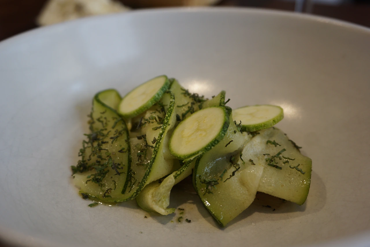 이어 나온 것은 세 가지 종류의 주키니와 무이꾸 생선. 작고 단단한 주키니와 커다란 주키니를 살짝 부드럽게 익히고, 차갑게 식혔다. 아래 들어있는 것은 커다랗게 토막 내 직화로 구운 주키니와 무이꾸라는 작은 생선이다. 까맣게 그을린 껍질에서 적당하게 불 향이 나는 가운데, 뼈째로 먹는 무이꾸가 잘 어울린다.