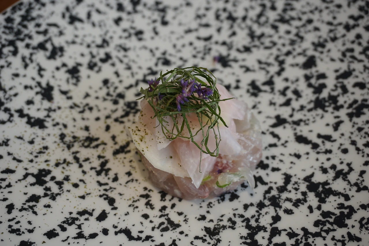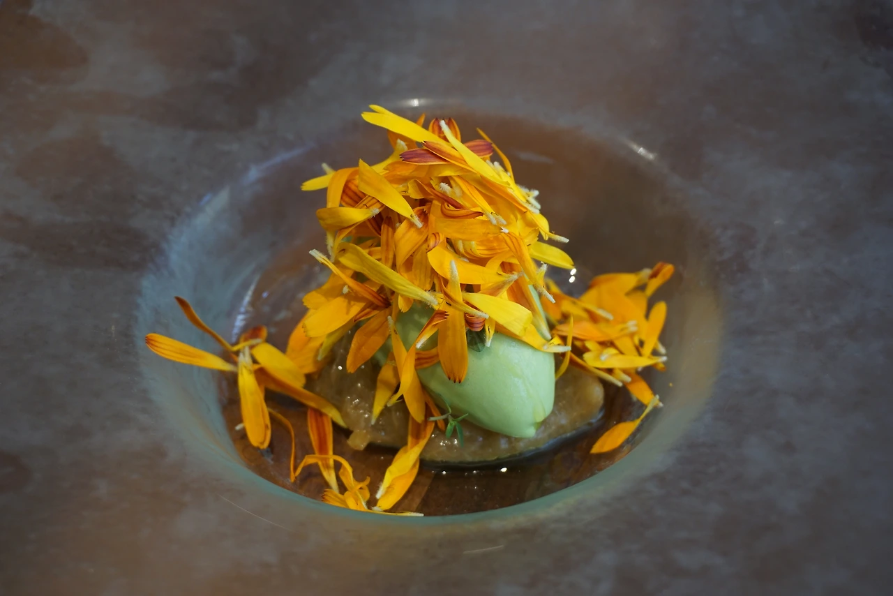 가운데의 수프에는 북쪽 지방의 순무가 얇게 저며져 들어갔다. 초록색으로 보이는 메리골드 오일과 생선알이 톡톡 터지는 맛이 매력적이었다. 포인트는 베이컨처럼 바삭하게 튀겨낸 감자 껍질. 뒤에 이어질 메뉴에 감자가 들어가니, 조금 다른 부분을 조금 다르게 활용했다는 것이었다. 위트 있는 해석이었다.
