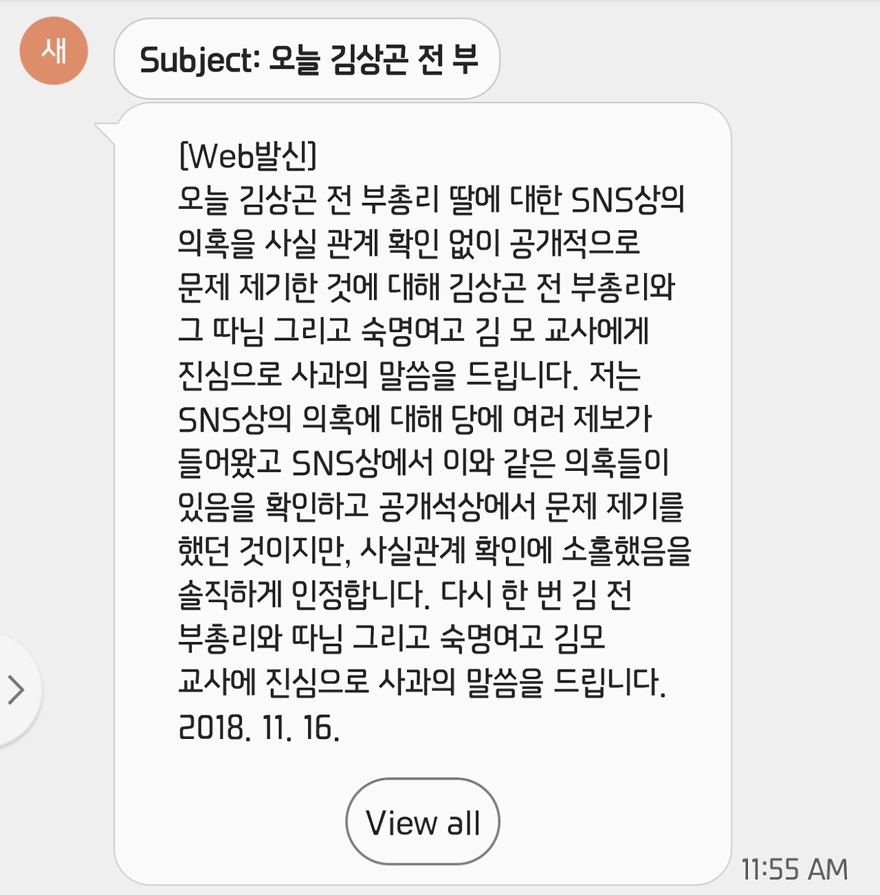 "세상을 떠들썩하게 하는 숙명여고 사태 당사자 김 모 교사가 얼마 전 사퇴한 김상곤 딸의 담임이었다고 SNS를 달구고 있다. 이 딸이 서울의 명문 사립대 치과대학에 합격했는데, 학종과 수시로만 뽑는 데다. 김상곤 딸이 학종과 수시로 들어갔다고 한다. 이것이 우연의 일치이길 바라지만 혹시 그런 게 아닌 게 있었는지 밝혀달라.(김용태)"