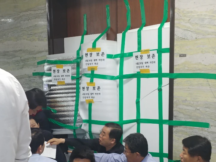 망설이지 말자고 연습이라도 한 것처럼, 한국당 의원들과 보좌진은 의안과로 거침없이 돌진했다. 팩스를 받을 수 있게 생긴, 종이가 꽂힌 기계란 기계는 전부 찾아다 전선과 통신선을 뜯다시피 뽑아댔다. 거의 사활을 건 것처럼 미친 듯이 의안과를 가득 메우고 뛰어다녔다.