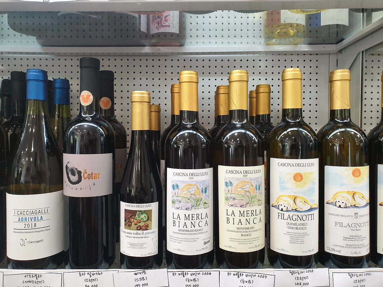 최근에 주목을 이끄는 주류 소매점은 전통주뿐만이 아니다. 바로 내추럴 와인(Natural Wine) 와인 역시 개성 있는 맛과 디자인으로 주목을 끌고 있다. 내추럴 와인이란 포도와 포도껍질의 자연 효모 외에는 아무것도 넣지도 빼지도 않은 와인. 자연 상태의 와인을 최대한으로 구현한 와인이라고 볼 수 있다. 아황산 등의 방부제를 넣치않아 세심하게 관리를 해야 하며. 다양한 천연균이 와인의 맛과 색을 만들어 기존의 와인보다 훨씬 다채로운 맛과 향을 가지고 있으며, 이러한 것을 라벨 디자인으로 녹여내 넘치는 개성을 가지 것도 특징이다.