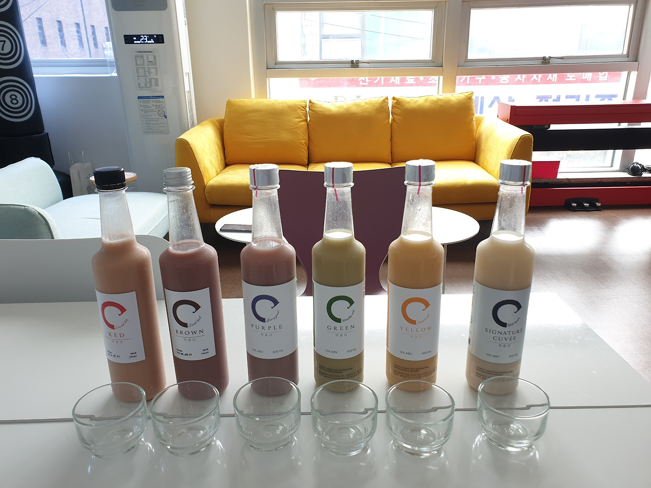 C 막걸리 시리즈. 오른쪽부터 시그니쳐 큐베, 옐로, 그린, 퍼플, 실험 중인 브라운과 레드. 각각 천연 재료를 통해 색과 맛이 강조되었다.