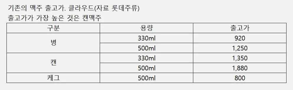 개인적으로 생맥주 가격의 상승이 좀 걱정이 돼요. 왜냐면 대부분이 요식업 업자들이 많이 계시다 보니, '가볍게 생맥주 한잔하자' 라는 시장은 작아지는 것이죠.