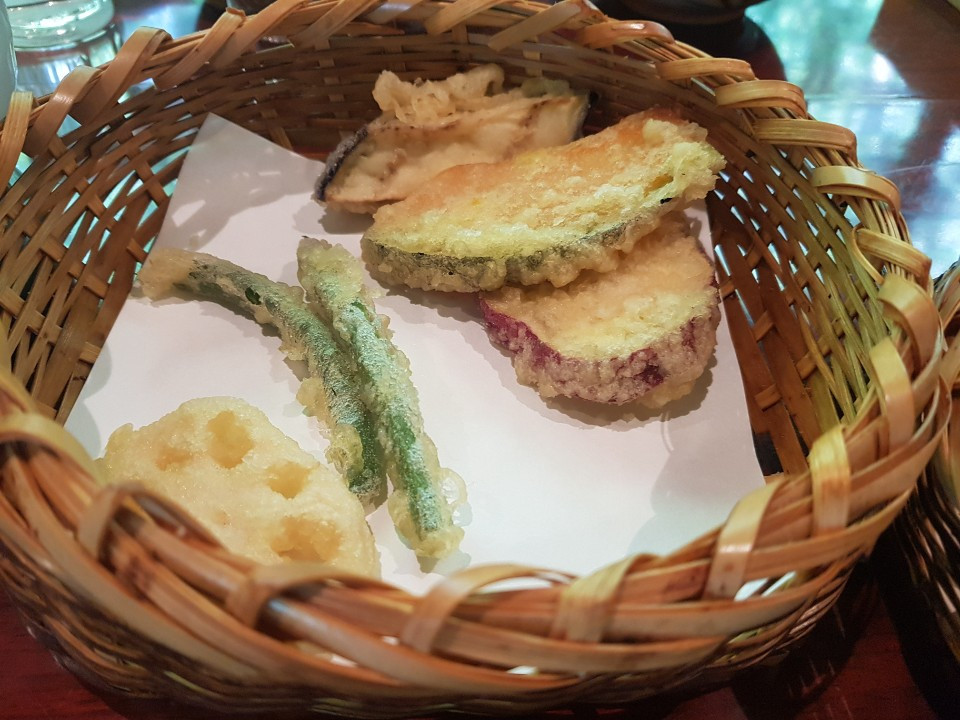 다양한 일본 사찰요리인 정진요리. 미소된장으로 맛을 낸 두부구이, 미린으로 맛을 낸 가지, 야채튀김 등
