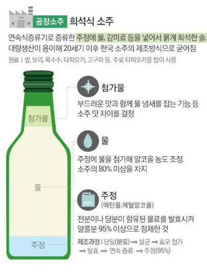 사실 희석식 소주는 곡물로부터 90% 이상의 알코올을 추출해 물에 섞는 방식으로 만들어집니다.