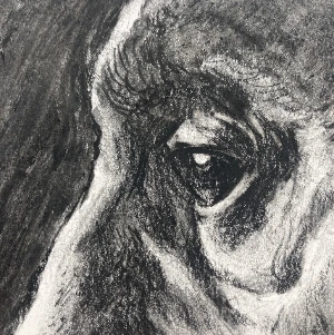 목탄으로 슥슥 스케치를 하고 어두운 부분을 먼저 칠하고 문질렀다. 지우개로 지우며 형태를 잡고, 목탄으로 겹쳐 칠하고 문지르기를 반복했다. 정확한 선따위는 필요하지도 중요하지도 않았다. 배경은 목탄을 부러뜨려 가루를 내어 문지르며 힘을 주었다. 저 선명한 노인의 푹 파인 눈과 주름을 위해 콘테를 사용했다. 어둠을 꽉 잡아내고, 밝음은 과감하게 지워냈다. 주름의 디테일은 잘 보이지 않아 도중에 그만두었다. 아마 주름에 매달렸으면 이 느낌은 나지 않았을 것이다.