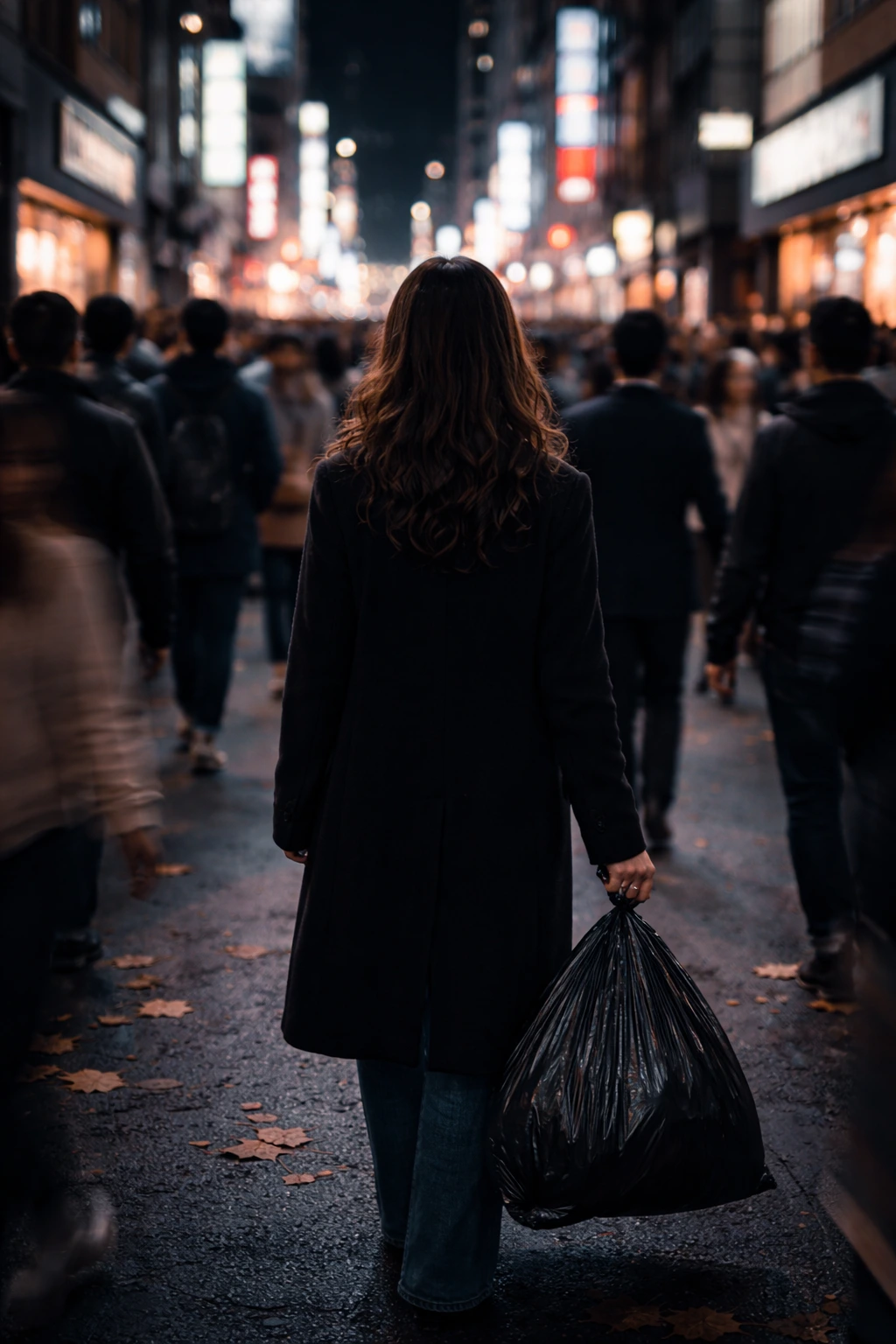 여자는 옷과 머리가 흐트러진 채였다. 구둣발에 밟힌 단풍잎 같았다. 두리번거리는 그녀의 눈은 무엇인가를 찾거나 아무것도 찾지 않는 것 같았다. 맨발에는 초점 없는 그림자만 걸렸다. 손에 들린 검은 봉지 밖으로 삐져나온 머리카락. 허벅지에 스치는 비닐봉지가 마른 잎 밟는 소리로 들렸다. 그녀 입에서 검은 침이 흘러나왔다. 갑자기 허공에 욕을 하기도 했다. 간혹 술 취한 취객들이 어두운 골목길로 여자를 데려가려고 했다. 그때마다 여자는 검은 봉지를 품에 안고 괴성을 질렀다. 그녀는 목적지가 있는 것처럼 맹목적으로 걸었다. 연말이 다가오는 번화가에서 한 무리의 사람들이 여자에게 괜찮냐고 물었다. 여자는 검은 비닐봉지 안에 손을 넣고 머리카락 사이에 든 것을 그들에게 보여주었다. 바람이 불고 나뭇잎이 우수수 떨어지는 계절이었다.