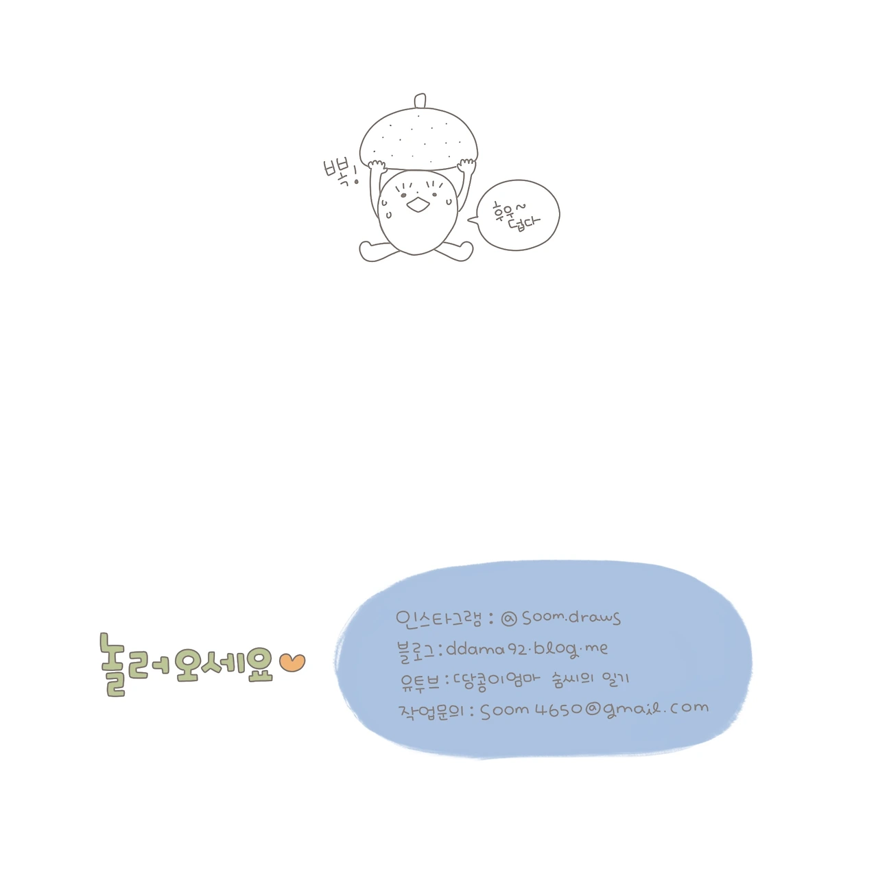 골드코스트에서 다정한 짝지님과 아기 땅콩이와 살고 있습니다. 그림을 그리고 일기를 쓰고 노래하는 것을 좋아합니다. 땅콩이의 귀여움을 오래도록 기억하기 위해 땅콩일기를 그립니다.