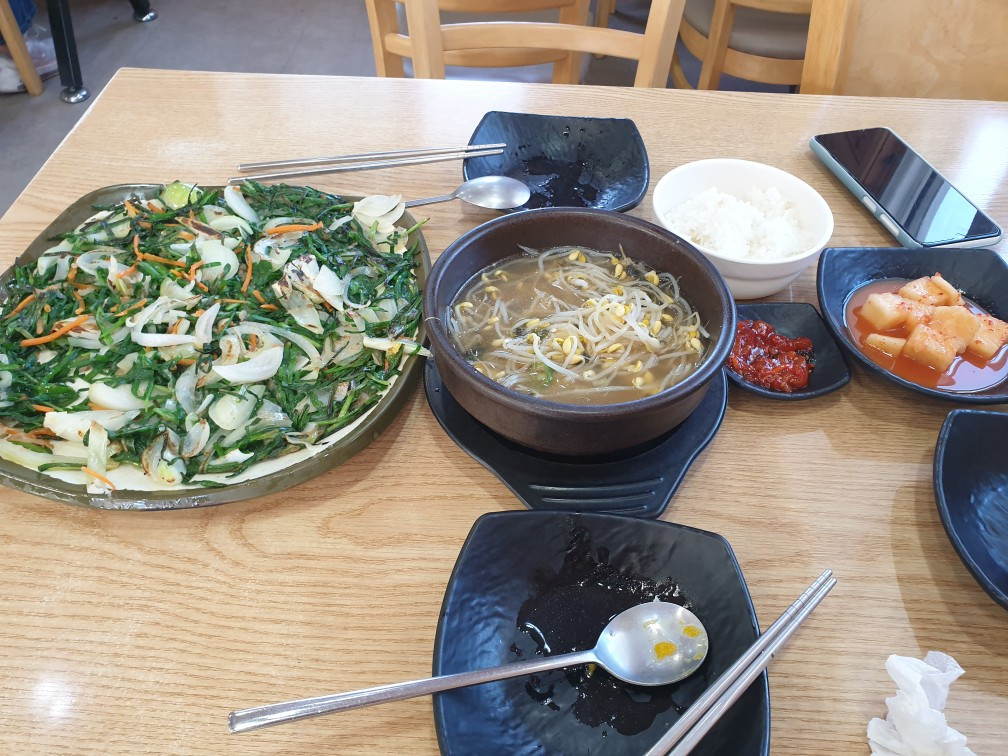 아이의 화실이 끝난 후 둘이 앉아 먹은 전주콩나물국밥과 메밀부추야채전.