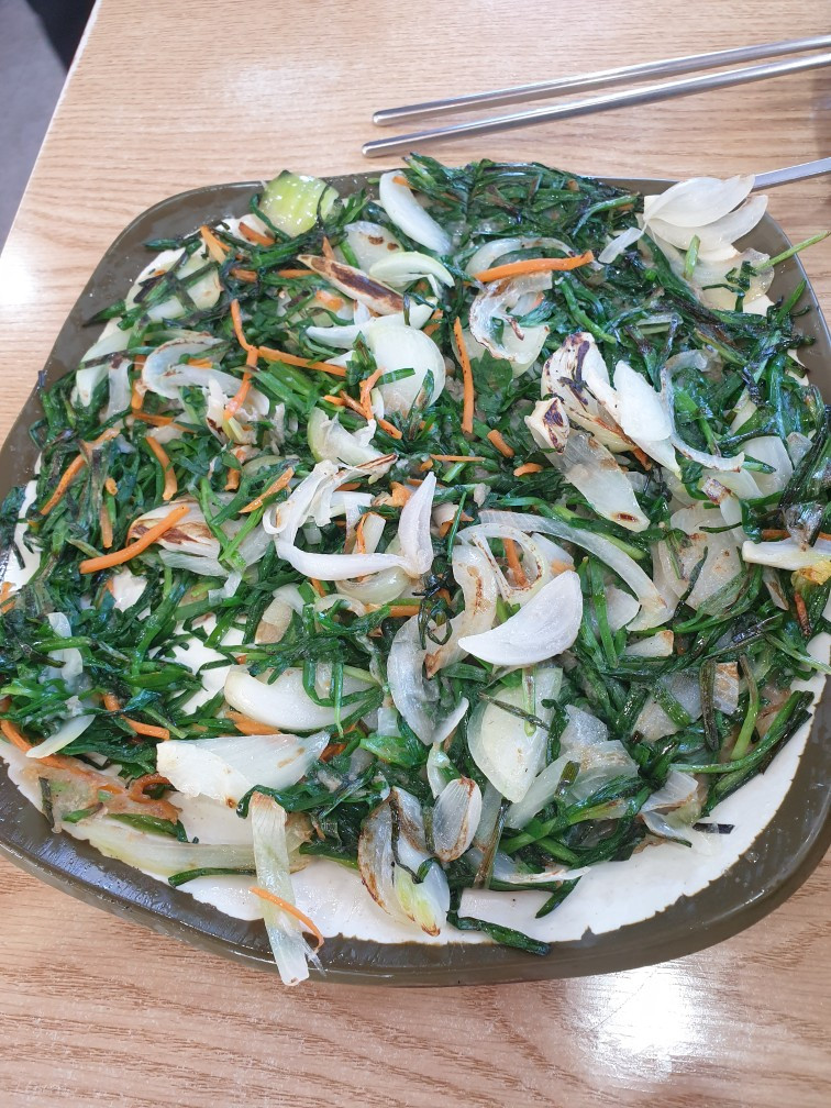 메밀부추야채전은 야채가 많이 들어가서인가 메밀이 퍼덕거려서인가 서로 붙지 않은 후두둑 외로운 친구들.