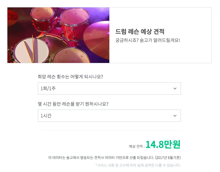 2017년 한 달 기준 드럼 레슨 예상 견적은 평균 14.8만 원