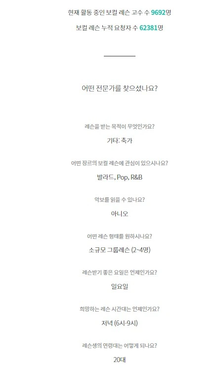다른 이용자들의 후기처럼 사람이 참 좋으세요. 남자친구랑 수다도 많이 떨고 죽이 잘 맞죠. 제가 보컬 관련 용어를 이해하지 못할 때 알아들을 때까지 비유해주시며 알려주세요. 짜증도, 화도 거의 없으신 고수님이랍니다.