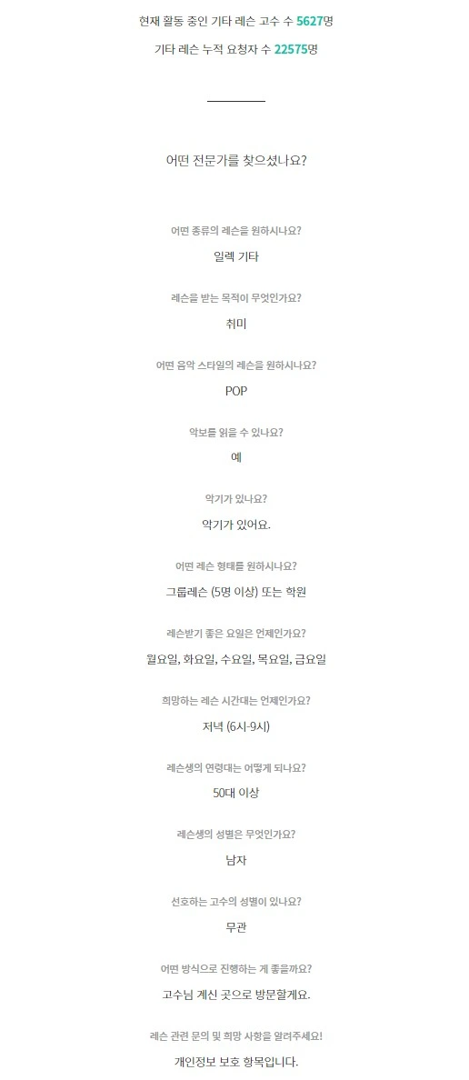 숨고에서 기타 레슨을 요청한 김연수님은 올해 65세로 스스로 어르신이라고 칭하는 유쾌하신 분이었습니다. 그는 학창시절 기타를 시작하여 직장을 다니면서도 밴드 생활을 해왔습니다. 하지만 30년전 교통사고에서 손을 다쳐 기타를 그만두었었죠. 최근 유명한 시니어 모델 '김칠두'씨와 닮았다는 이야기를 들으며 모델로서의 도전을 위해 학원을 다니기 시작했습니다. 김연수님은 본인의 개성을 찾아가기 위해 30년전 그만둔 기타를 다시 손에 쥐셨답니다.