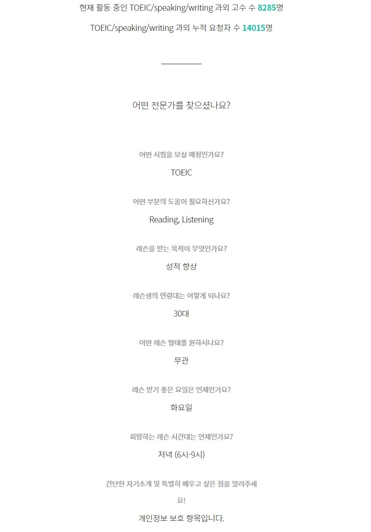 숨고에서 토익 과외를 요청한 정윤미님은 회사와 대학원을 병행하는 직장인입니다. 정윤미님은 진급 시험을 앞에 두고 단기간 수업을 위해 학원을 다녔지만, 거리가 멀고 업무 시간도 변동적이어서 금방 포기하셨어요. 그래서 일대일 수업이 가능하고 수업 시간을 유동적으로 정할 수 있는 김홍석 고수님을 만나게 되었답니다.
