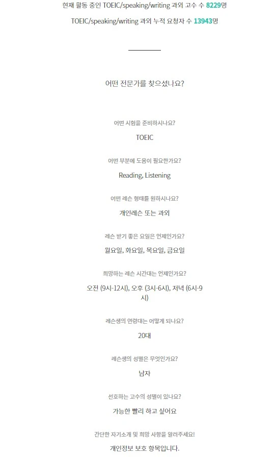 저는 이전에 영어로 무언가 말을 하려고 하면 생각을 오래할 수 밖에 없었어요. 이제는 혼자서 영어 문장도 많이 만들어보고 '말이 되는 말'을 많이 하게 되었어요. 영어에 대한 거부감이 많이 사라졌습니다. 1주일에 단 두번만 고수님을 만나지만 그 전후에 예습과 복습시간을 스스로 가져 수업에 대한 노력도 많이 하는 편이에요.