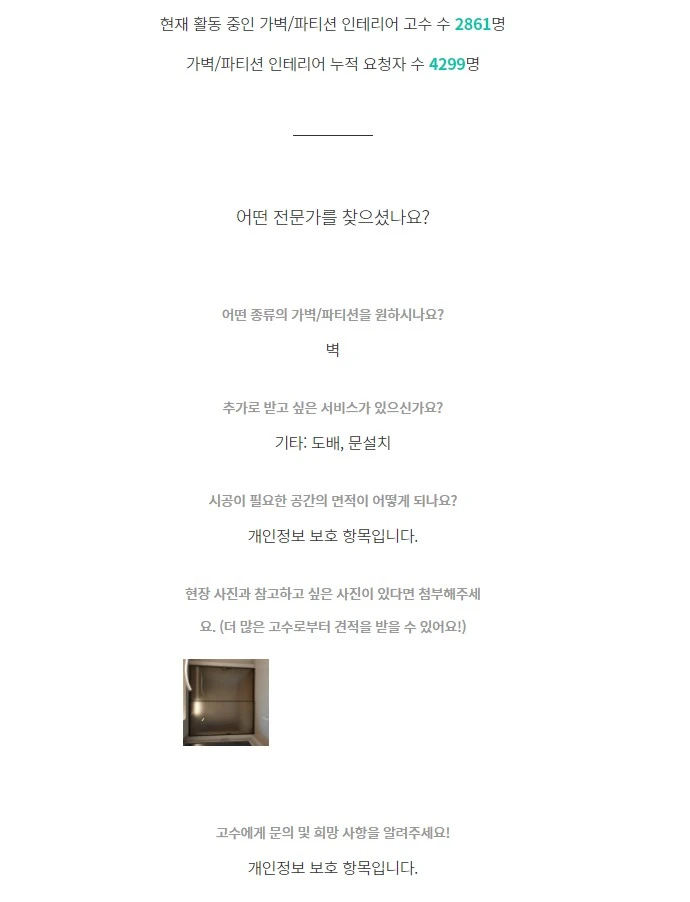 그래서 슬라이딩 도어를 떼어내고 가벽을 설치하려고 전문가를 찾았어요. 숨고에서 요청서를 작성하니, 여러 고수님들에게 견적서가 왔어요.