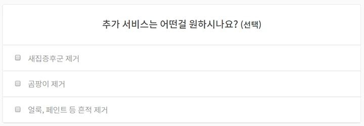 입주 시 좀 더 나은 환경에서 살고 싶다면 추가 서비스 역시 고려해야 한다. 추가 서비스는 크게 새집 증후군 제거, 곰팡이 제거, 얼룩 및 페이트 등 흔적 제거가 있다. 신축 건물의 입주 청소 시 새집증후군 제거와 얼룩, 페인트 제거를 이사 청소의 경우 곰팡이 제거를 생각해 볼 수 있다. 특히 요즘과 같은 여름철에는 곰팡이 제거를 추가 서비스로 받아도 괜찮을 듯하다.