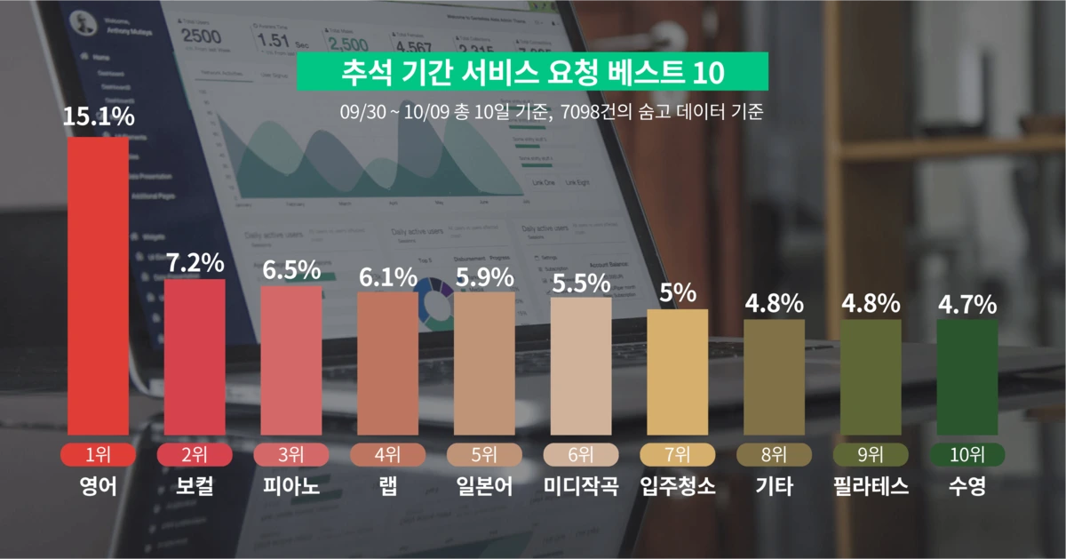 이 정말 많고, 수 많은 요청 중 가장 많이 찾으신 서비스는 1위 영어 과외, 2위 보컬 레슨, 3위 피아노/키보드 레슨, 4위 랩 레슨, 5위 일본어 과외, 6위 미디/컴퓨터 작곡 레슨, 7위 이사 / 입주 전 청소, 8위 기타 레슨, 9위 필라테스, 10위 수영 입니다.