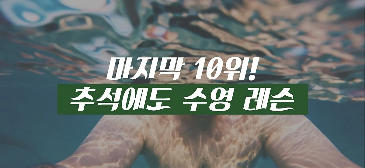 마지막 10위는 바로! 수영 레슨입니다. 수영을 단순히 계절 한정 스포츠라고 생각하신다면 경기도 오산!~ 수영의 매력에 빠진다면 아무도 헤어 나올 수 없다고요! 추석에도 이렇게 많은 분들이 수영을 즐기려고 준비 중이시니깐요!