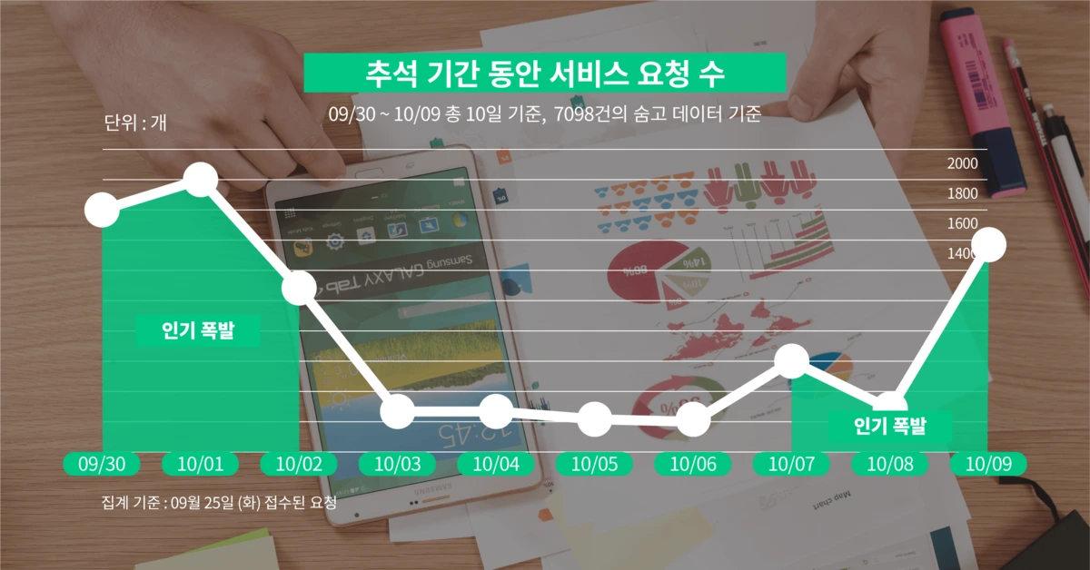 9/30(토)~10/9(월) 기간 사이에 숨은고수님을 만나 서비스를 받으시려는 분들의 요청 건이 9/25 (화) 기준으로 무려 7,098건이 들어왔답니다! 지금 이 순간에도 계속해서 요청은 쌓이는 중! 추석 당일 직전과 직후에 특히 새로운 시작을 준비하시는 분들이 정말 많고, 수 많은 요청 중 가장 많이 찾으신 서비스는 1위 영어 과외, 2위 보컬 과외, 3위 피아노/키보드 레슨, 4위 랩 레슨, 5위 일본어 과외, 6위 미디/컴퓨터 작곡 레슨, 7위 이사/입주전청소, 8위 기타 레슨, 9위 필라테스, 10위 수영입니다. 그밖에도 헬스 트레이닝, 퍼스널컬러/이미지메이킹,얼굴경락마사지, 펫 시터 등 다양한 서비스를 요청들이 있었어요!