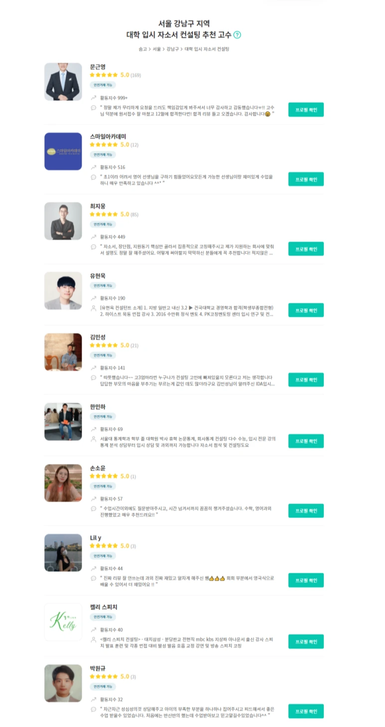 지난 해 입시를 경험한 선배 고수부터, 입시 전형을 꿰뚫고 있는 전문가까지 숨고 안에 있습니다.