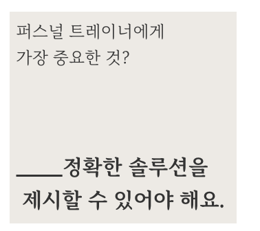 이런 모든 문제들은 당장의 약으로 치료하는 것이 아닌 앞으로도 편안한 움직임을 잘 해낼 수 있도록 올바른 체형과 자세교정을 통한 가이드라인을 제공해야 하기 때문에 퍼스널 트레이너로써 가장 중요한 자질은 회원님의 몸 상태를 정확히 파악하고, 솔루션을 제공할 수 있는 능력이라고 생각해요.