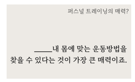 꾸준히 운동하셨던 분들도 자신의 몸에 관심이 많지만 깊이 알지 못하는 경우가 많거든요. '어디가 왜 아픈지', '이 동작은 왜 안 되는 건지' 원인에 대해 알지 못하기 때문에 꾸준히 운동하더라도 고쳐지지 않은 경우가 많아요. 퍼스널 트레이닝은 내 상태가 어떤지를 파악하며 움직임과 또 어떻게 개선해야 하는지에 대해 알 수 있어요. 할 수 없었던 움직임을 하게 되는 순간의 기쁨, 이것이 저는 퍼스널 트레이닝의 가장 큰 매력이라고 생각해요.