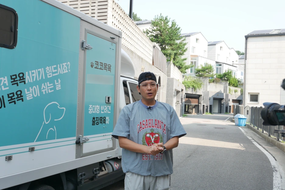 네, 반갑습니다! 저는 코코목욕이라는 이름으로 중, 대형견 출장 목욕 트럭을 운영하고 있는 숨고 펫 미용 서비스 고수 송성훈이라고 합니다.