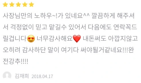 게다가 친절하시기까지❤️ 다른곳보다 훨씬 만족스러워요앞으로 자주 찾을예정입니다^^소개도 많이 시켜드리려구요!! 내집처럼 꼼꼼하게 잘해주셔서 감사해요.