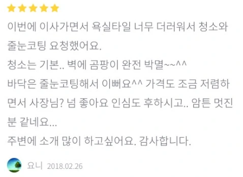 이번에 이사가면서 욕실타일 너무 더러워서 청소와 줄눈 시공 코팅 요청했어요.