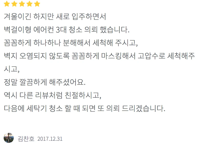 겨울이긴 하지만 새로 입주하면서 벽걸이형 에어컨 3대 청소 의뢰 했습니다.