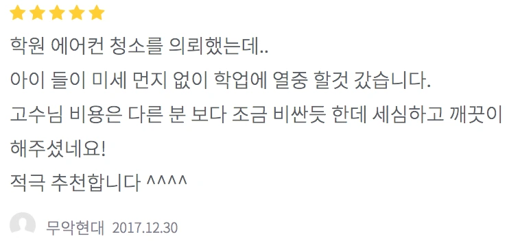 아이 들이 미세 먼지 없이 학업에 열중 할것 갔습니다. 고수님 비용은 다른 분 보다 조금 비싼듯 한데 세심하고 깨끗이 해주셨네요! 적극 추천합니다 ^^^^