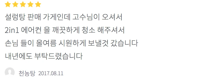 설렁탕 판매 가게인데 고수님이 오셔서 2in1 에어컨 을 깨끗하게 청소 해주셔서 손님 들이 올여름 시원하게 보낼것 갔습니다. 내년에도 부탁드렸습니다.
