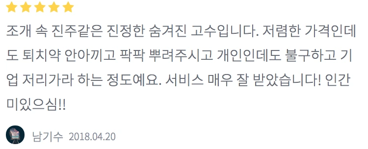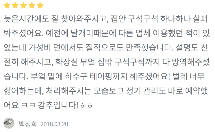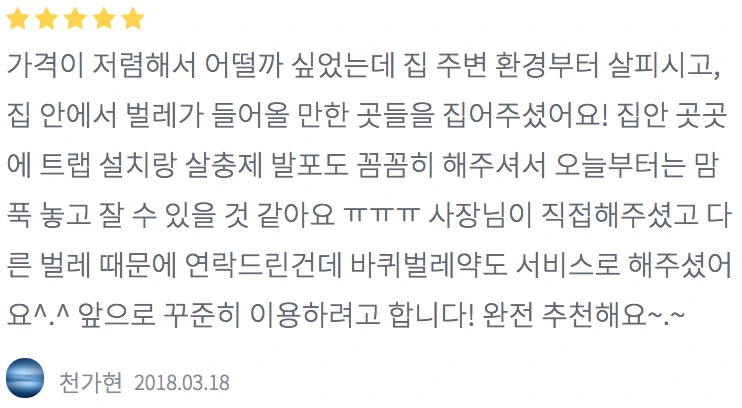 조개 속 진주같은 진정한 숨겨진 고수입니다. 저렴한 가격인데도 퇴치약 안아끼고 팍팍 뿌려주시고 개인인데도 불구하고 기업 저리가라 하는 정도예요. 서비스 매우 잘 받았습니다! 인간미있으심!!