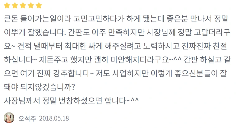 큰돈 들어가는 일이라 고민고민하다가 하게 됐는데 좋은 분 만나서 정말 이쁘게 잘했습니다. 간판도 아주 만족하지만 사장님께 정말 고맙더라고요~ 견적 낼 때부터 최대한 싸게 해주실려고 노력하시고 진짜진짜 친절하십니다~ 제돈주고 했지만 괜히 미안해지더라구요~^^ 간판 하실고 같으면 여기 진짜 강추합니다~ 저도 사업하지만 이렇게 좋으신분들이 잘 돼야 되지 않겠습니까? 사장님께서 정말 번창하셨으면 합니다~^^