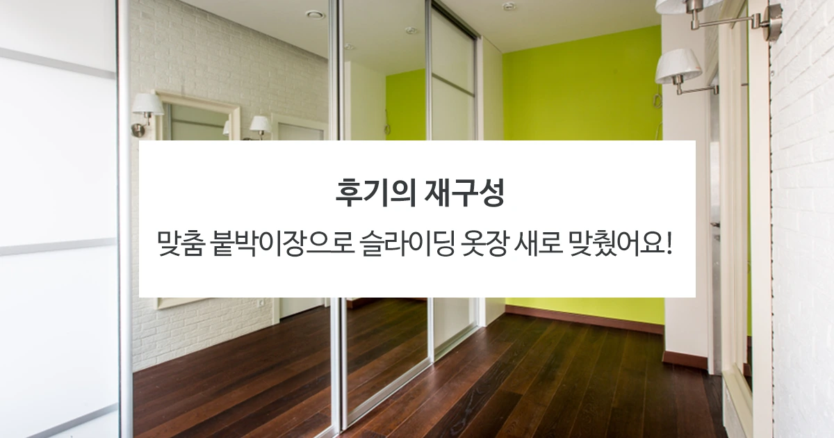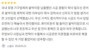 국내 유명 가구업체에 붙박이장 납품했던 시공 경험이 워낙 많으신 관계로 붙박이장 제작에 대한 자부심이 워낙 강하셔서 신뢰도가 엄청 생겨서 큰 고민없이 선택했습니다. 우선 가격도 합리적이구요 시공도 이사 당일 오전에 다 해놓아서 편리했어요. 화이트톤의 펄 들어간 붙박이장으로 시공했는데 너무 튼튼하고 우선 집 안이 환해진 것 같아 매우 만족합니다. 무엇보다 사장님과 컨택이 수월해서 시공관련 의문점을 바로바로 해결할 수 있던 게 가장 좋았어요! 강추합니당!!