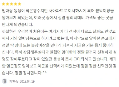 까칠하신 우리엄마 처음에는 여기저기 다 견적이 다르고 날짜도 안맞고해서 거의 일반장농으로 하시려고 했는데, 마지막으로 알아본 숨고에서 정말 딱 맘에 드는 붙장이장을 만나게 되셔서 지금은 기분 몹시 좋아하십니다. 특히 상담해주실때 까칠했던 엄마한테 정말 끝까지 친절하게 설명도 잘해주셨다고 같이 있었던 동생이 몹시 고마와하고 있습니다. 제가 한 열곳정도 알아보고 이곳을 선택하게 되었는데 정말 잘한 선택인것 같습니다. 장말 감사합니다.^^