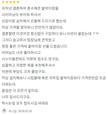 막상 설치해보니 시집올때 해온 저희집 붙박이장보다 가격은반값 조금 더돼는데. 품질은 더 조은거 같아요. 너무 감사드리구요. 하시는일 모두 잘되시길 바래요