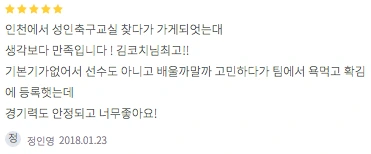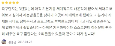 축구한지는 3년됐는데 아직 기본기를 체계적으로 배운적이 없어서 제대로 배워보고 싶어서 레슨받을곳을 찾다가 이곳에서 배워보게 됐어요. 기본기나 자세를 제대로 잡아주시고 프로그램도 빡빡한느낌이 아니고 재밌게 즐길수 있게 알려주셔서 좋았습니다~ 아직은 기본과정이라 스스로한테 아쉬운데 꾸준히 배우면 축구 좀한다는 소리들을수 있을꺼 같아 기대가 됩니다!