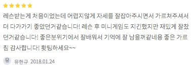 레슨받는게 처음이었는데 어렵지않게 자세를 잘잡아주시면서 가르쳐주셔서 더 다가가기 좋았던거같습니다! 레슨 후 미니게임도 지긴했지만 재밌게 잘찼던거같습니다! 좋은분위기에서 잘배워서 기억에 잘 남을꺼같네용 좋은 가르침 감사합니다! 홧팅하세요~