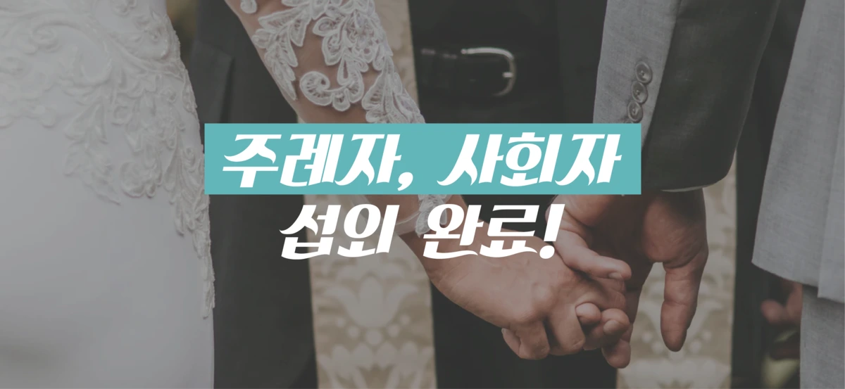 결혼식을 진행해줄 우리 신랑, 신부님들의! 주례자와 사회자를 구해야겠죠! 주례사를 해주실 은사/지인 등을 미리 연락하여 부탁할 수도 있어요! 사회도 친구/지인 등을 통해 미리 약속을 하게 되겠죠!