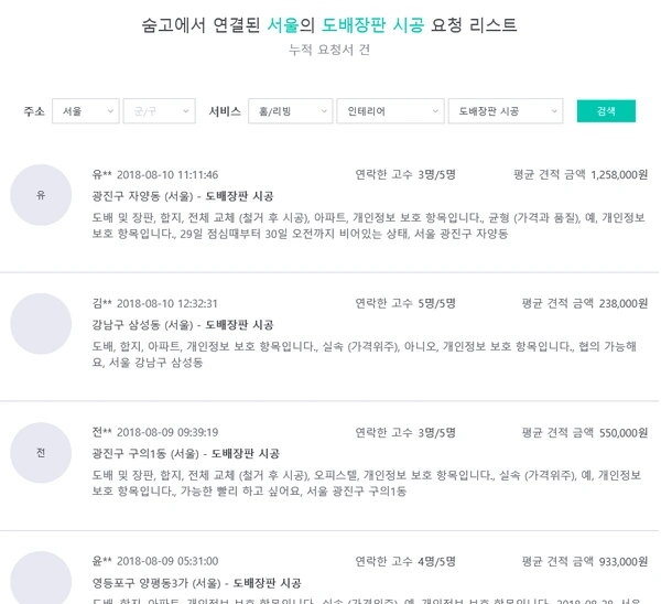숨고에는 도배장판시공 뿐만 아니라 인테리어 필름 시공, 장판 시공, 마루 보수 등 인테리어 시공을 찾는 요청자들이 숨고에서 업체를 찾고 있답니다.
