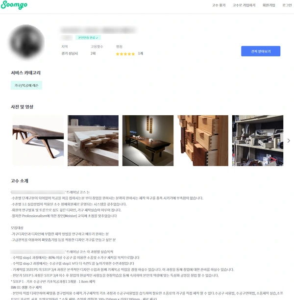 매번 공방의 사진을 올리고 목공배우기 현장을 블로그에 업로드 하는 일도 작은 일이 아닙니다. 숨고에서 단 한 장! 프로필페이지 한 장에 당신의 이력, 커리큘럼, 활동 사진 그리고 영상을 올려주세요.