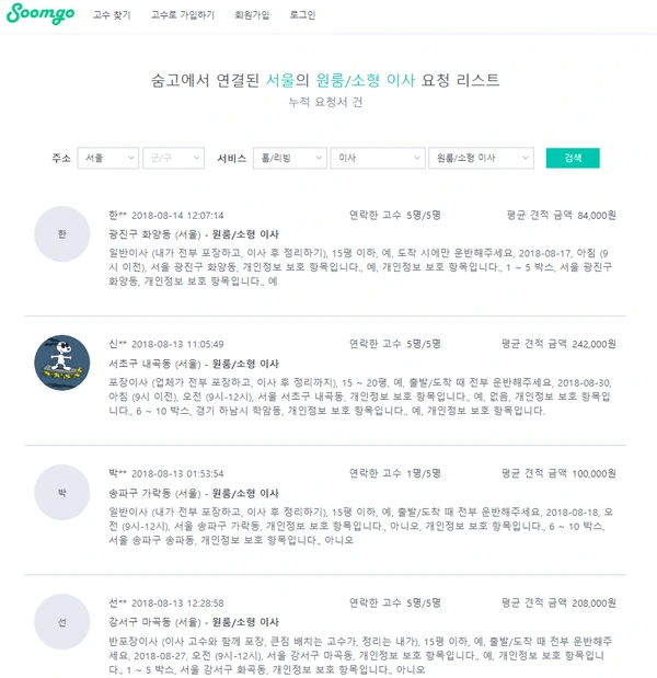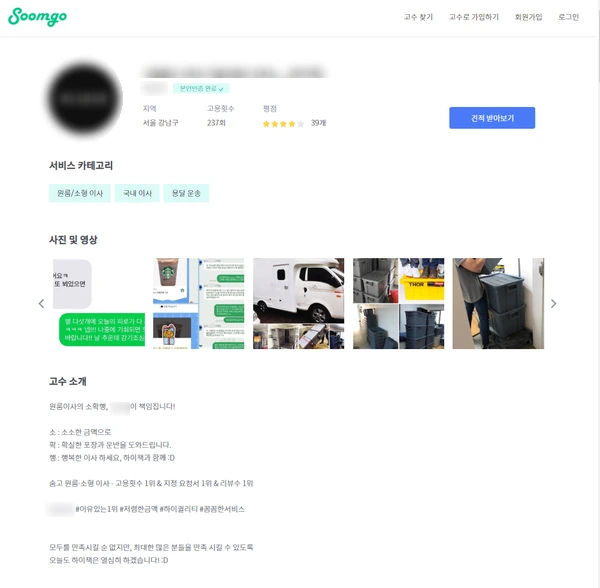 그러던 와중 어느 지인의 소개로 숨고를 알게 되어 지금은 전적으로 숨고를 통해서 이사를 진행하게 되었습니다.